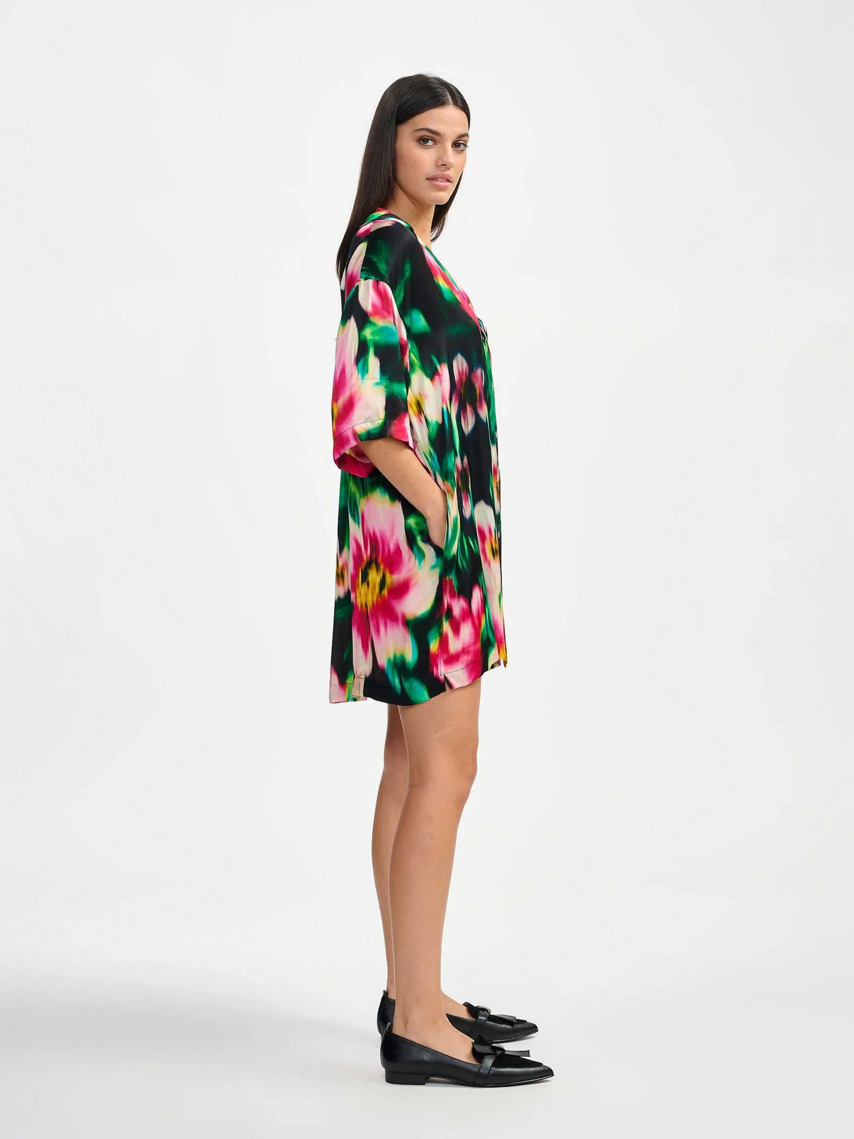 Inspirée Des Chemises De Bowling, La Mini-Robe Planets Est Juste Assez Fun Pour Être Hyper-Branchée. Une Coupe Simple, Confortablement Oversize, Avec Des Fentes Latérales Et Un Pli Creux Dans Le Dos, Le Tout Dans Une Viscose À Fleurs Pour Un Look Extra-Chic.