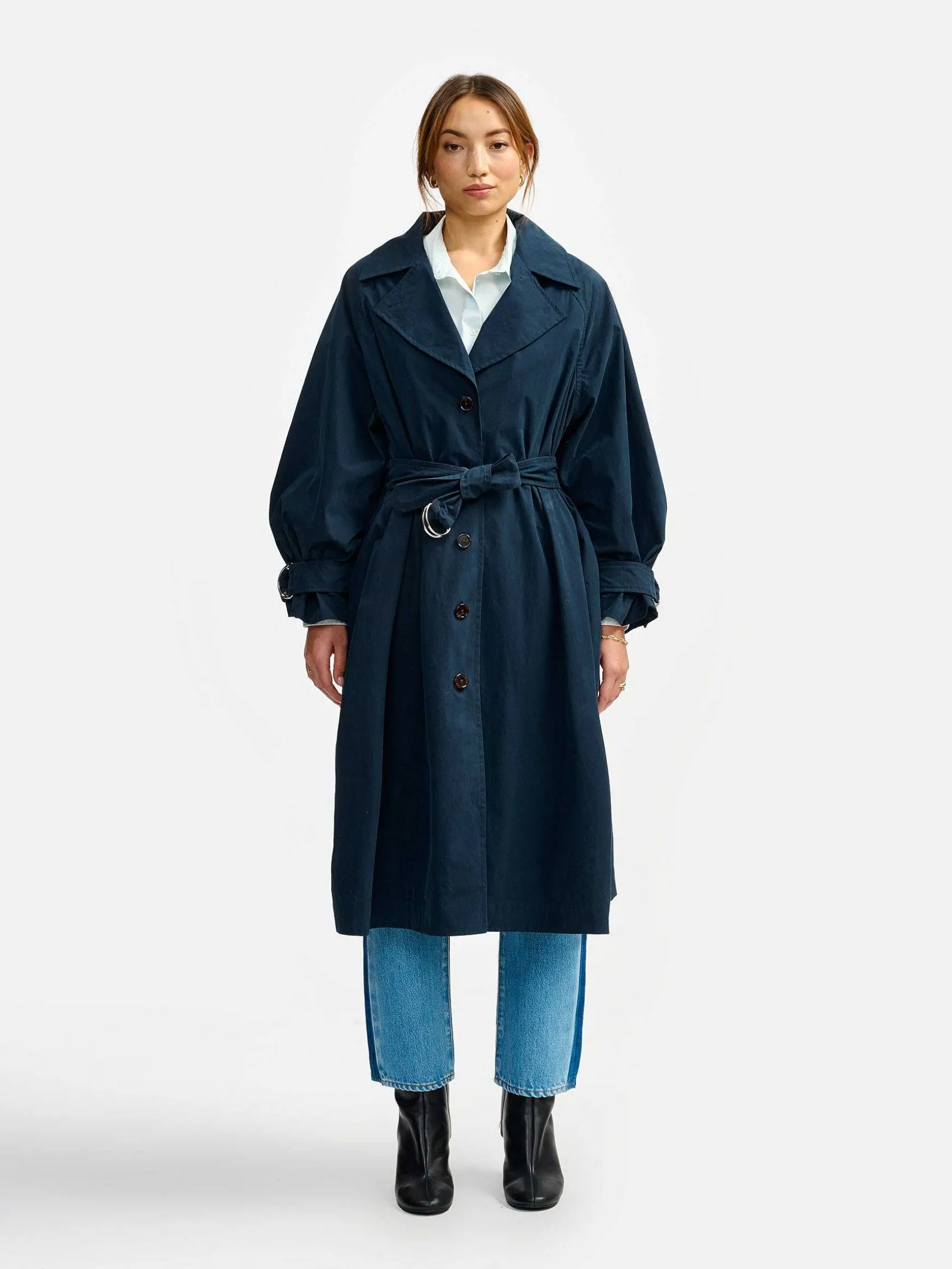 Entre Son Style Vintage, Son Bleu Intemporel Et Son Volume Incroyable, Harash Est Le Trench Le Plus Convoité De La Saison. Ce Manteau Déperlant Est Structuré Par Un Col Large Et Des Manches Amples Que Vous Pouvez Faire Bouffer En Resserrant Les Poignets.
